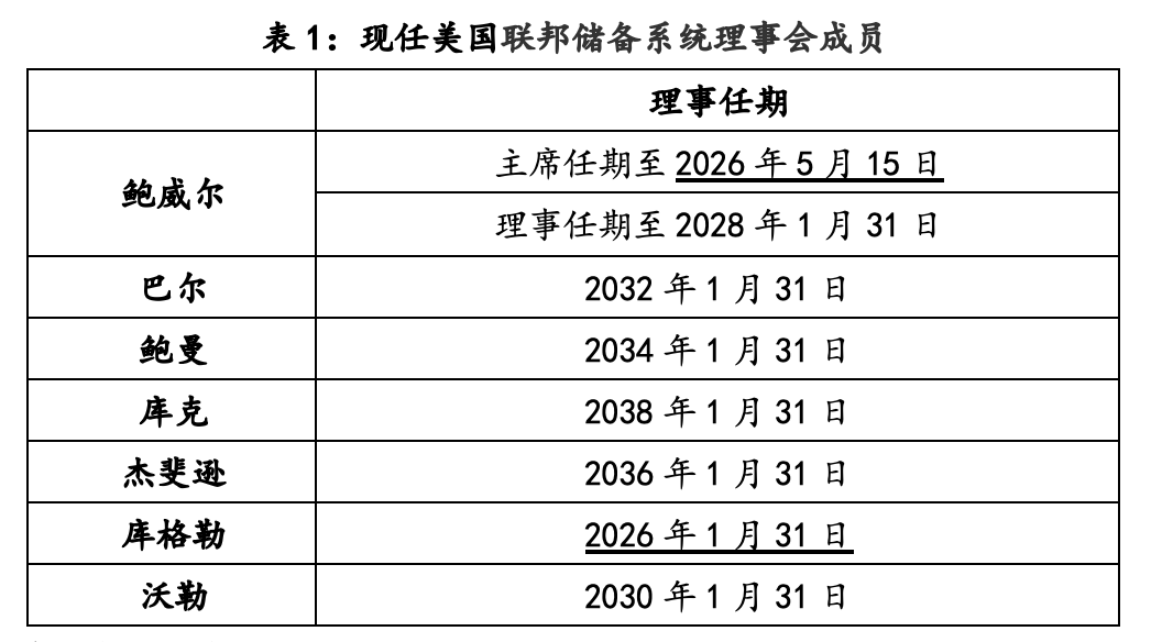 鲍威尔联储主席的任期将于2026年5月15日结束,意味着在明年5月份之前,特朗普就应提名下任主席候选人,并提交参议院审议。按照规则,联储主席候选人只能从联储理事里选择,由于现任理事库格勒任期将于2026年1月31日到期,鉴于美联储理事任期结束后不能连任,因此必须要有新人补充进来。